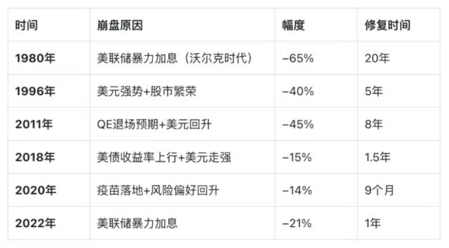 回顾黄金历年的跳水事件,思齐指出,尽管黄金会随着这些政策的变动波动,但每次回撤后,却都创出了新高。风险往往伴随着机遇。